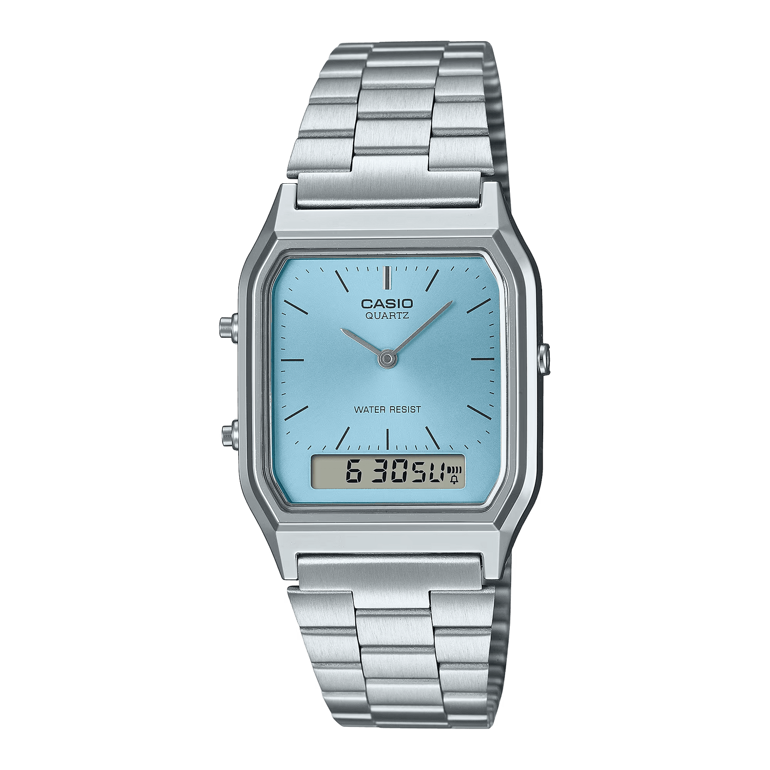 The angular case frames a dial updated in the latest color trends. Retro simplicity meets modern functionality in an analog watch with small digital window for the info you need at your fingertips. A versatile, elegant design to complement every occasion, from dressy formal events to casual outings.