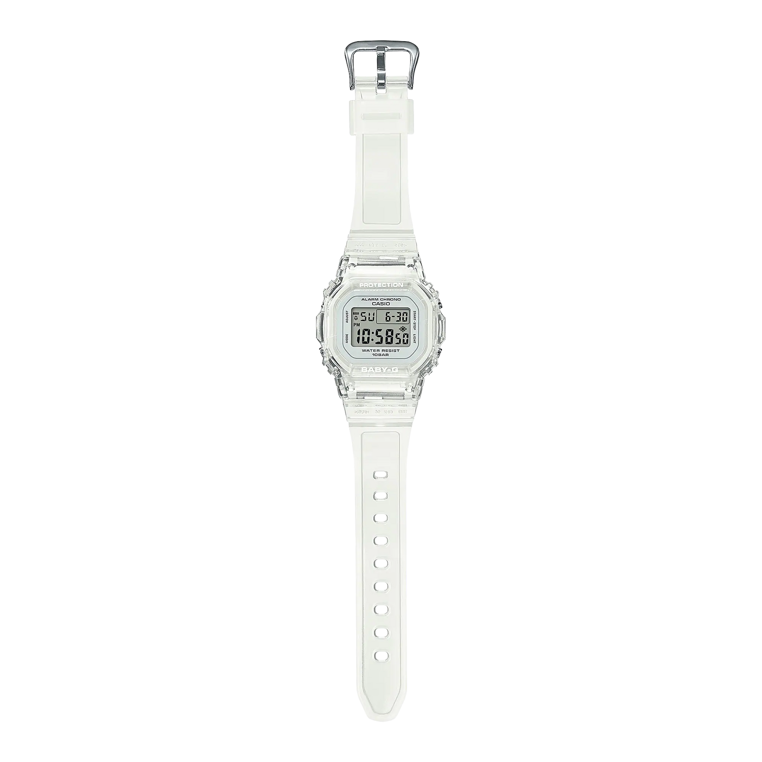 The classic BABY-G square look you love — now in an even slimmer, more compact design. The smaller BGD-565 case is 2.6mm shorter, 2.1mm narrower, and 1.2mm slimmer than its predecessor and is designed to appear flat when viewed from the side for an even thinner look. In icy translucent clear to match any fashion statement you choose.