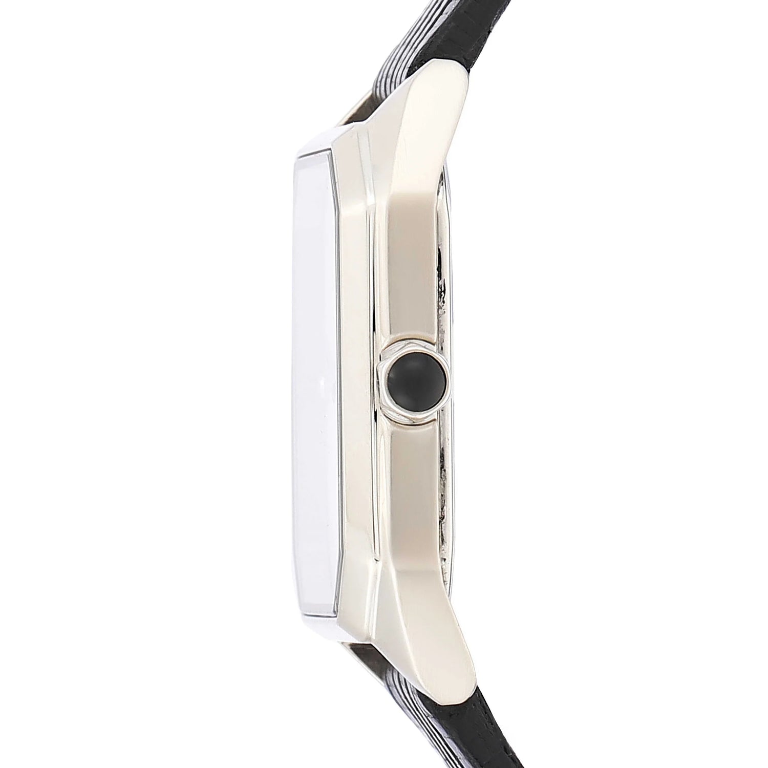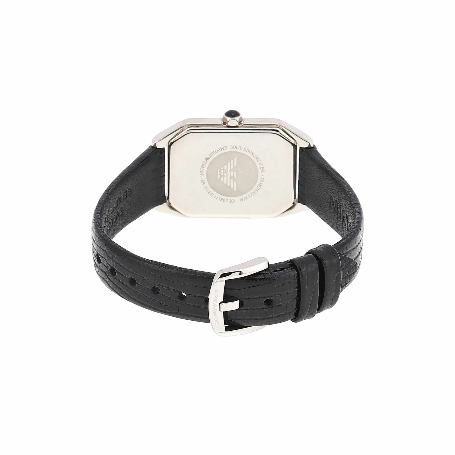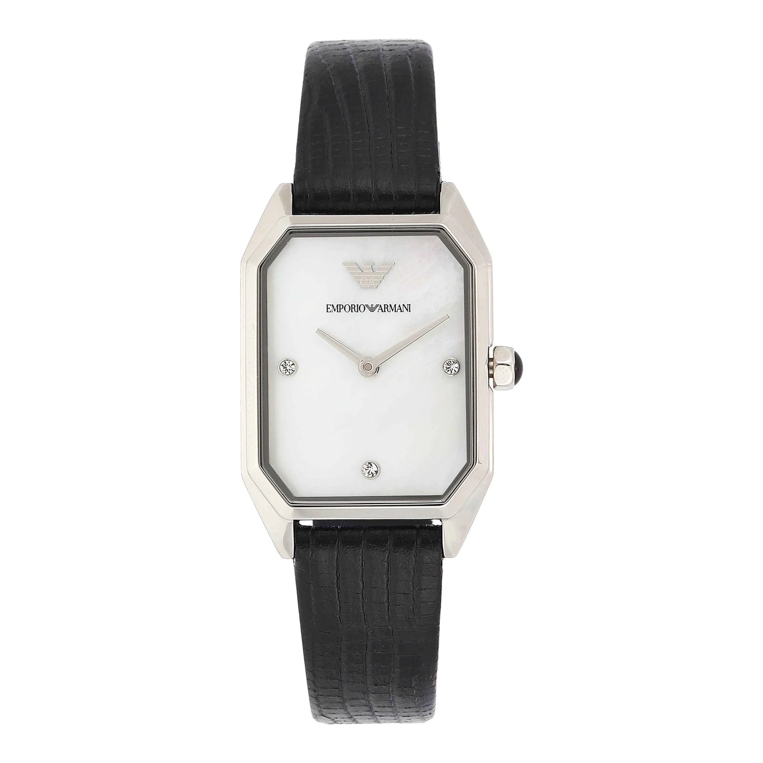 This 24mm watch features a glossy white mother-of-pearl dial with dot indexes, two-hand movement and black leather strap.