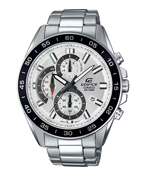 A large standard EDIFICE chronograph. Use of an extra-thick inset dial creates a powerful, dynamic design.