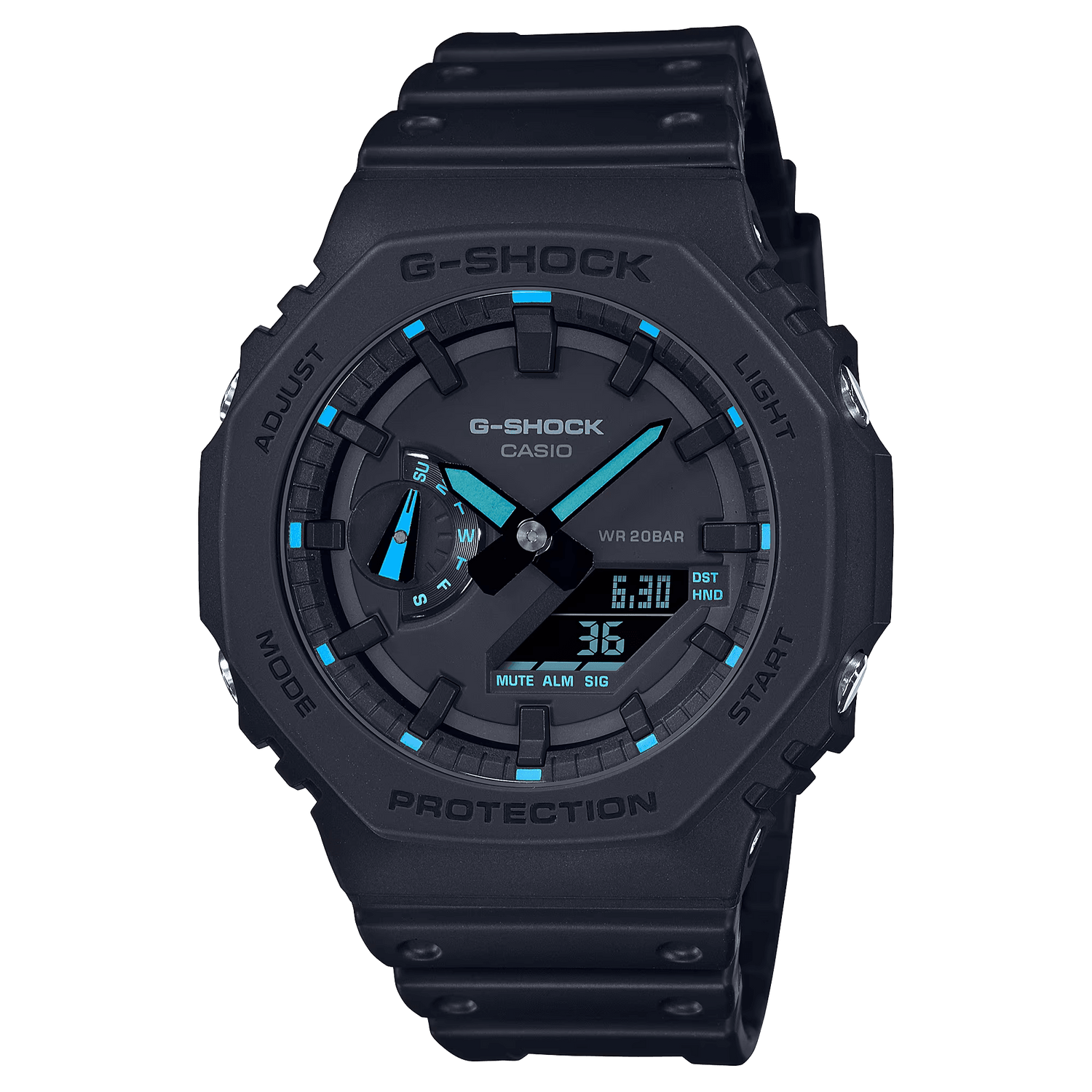 The octagonal shape and streamlined design of the GA-2100 puts on textured matte black and vibrant neon color for a stylishly cool new look. Hour and minute hands with phosphorescent paint stay visible in the dark to keep you on your game all day and night.