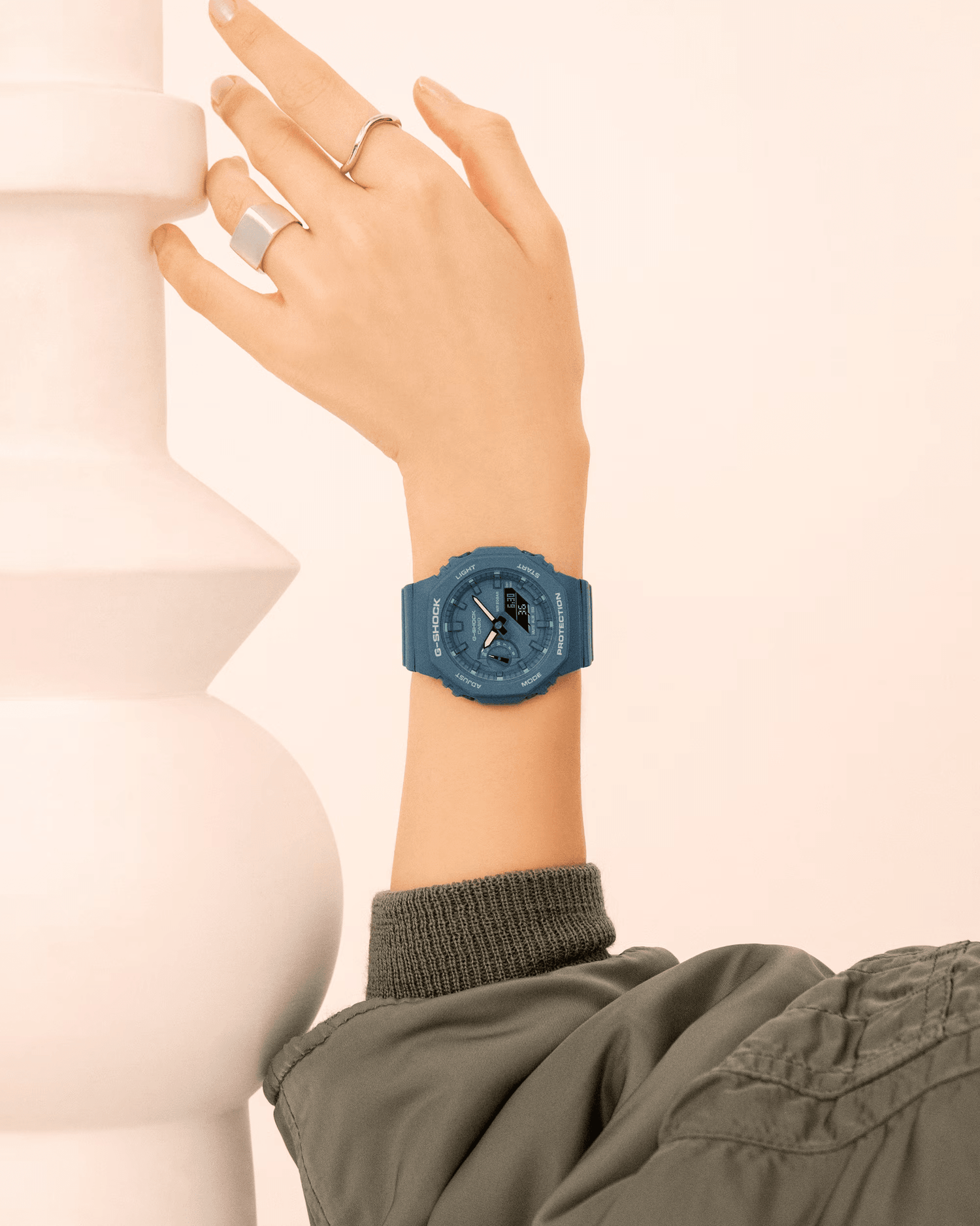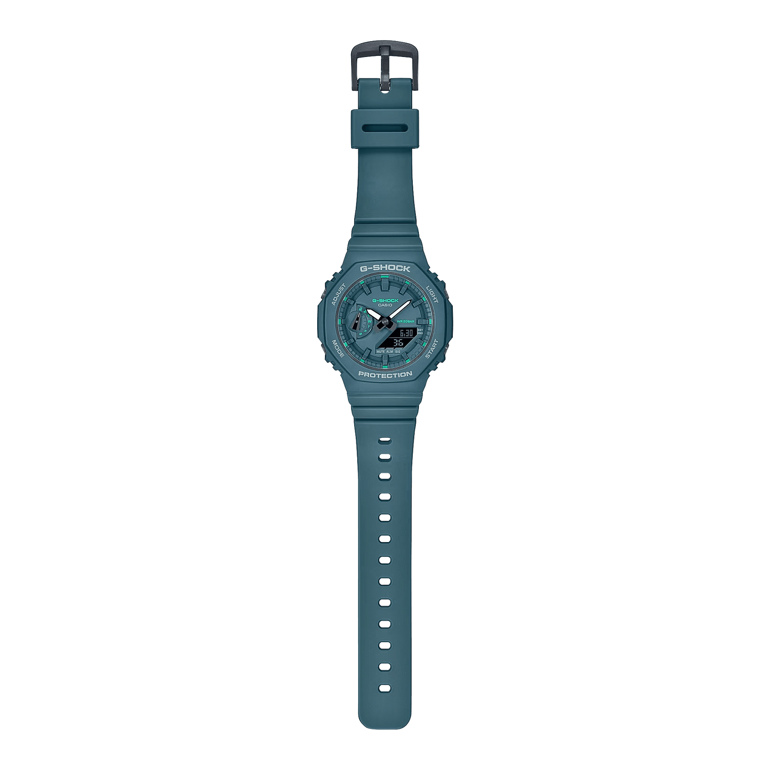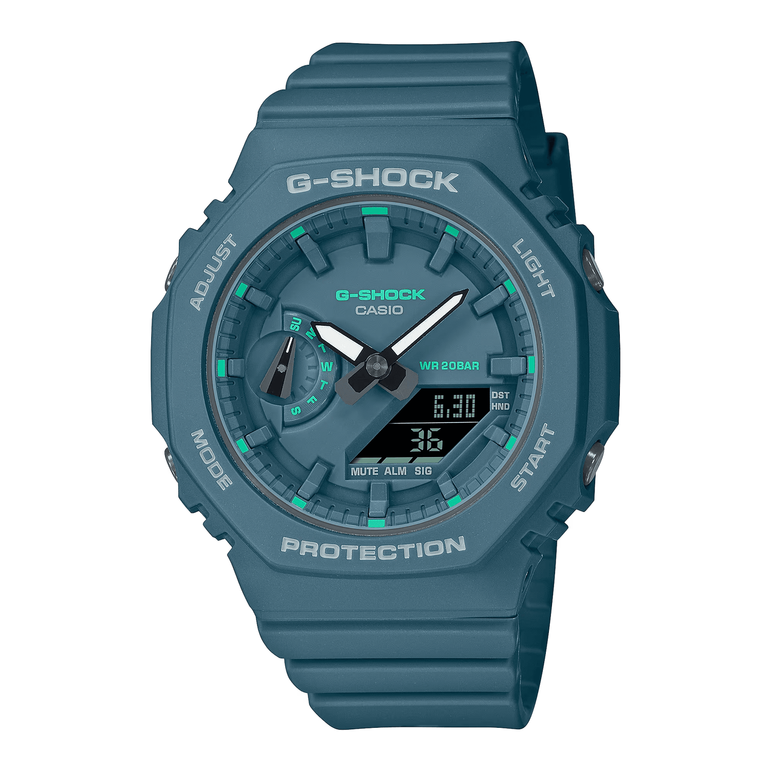Go stylish and comfortable with the slimmer, more compact analog-digital GMA-S2100 featuring modern green accents. The flat face and simple bar index marks come together in a streamlined, satisfying design. An original spin in on-trend green for details like the logo, index mark, and LCD makes this watch a perfect street fashion accessory.