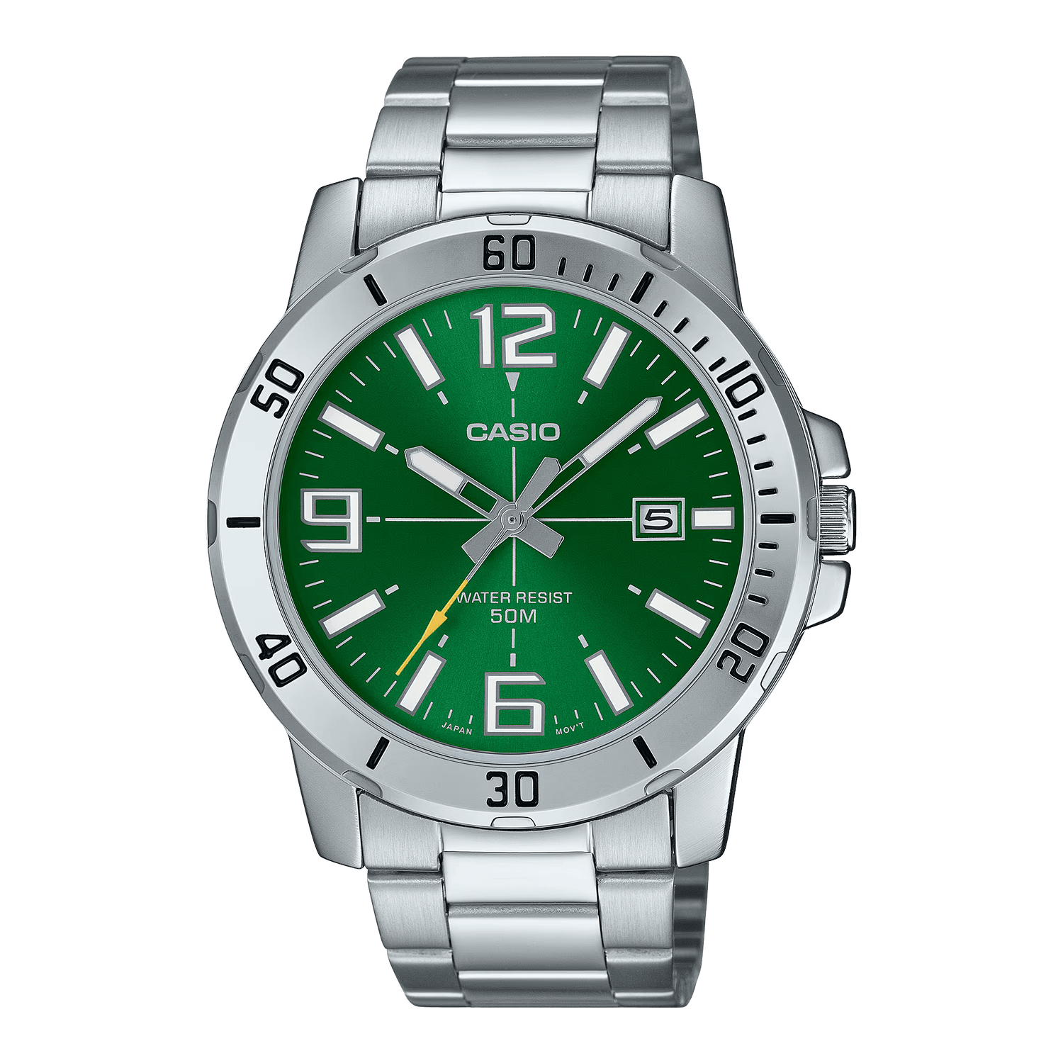 The thick bezel adds a sporty touch to a metal analog watch designed around the classic hour, minute, and seconds hand look.