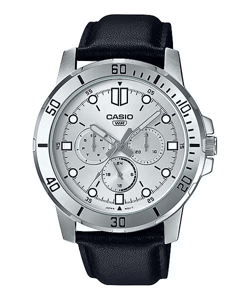 Regular timekeeping: Analog: 3 hands (hour, minute, second), 3 dials (date, day, 24-hour)