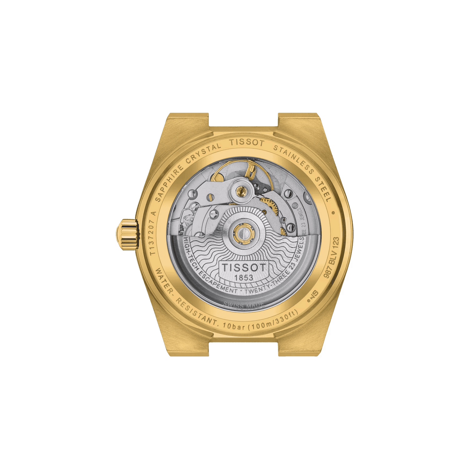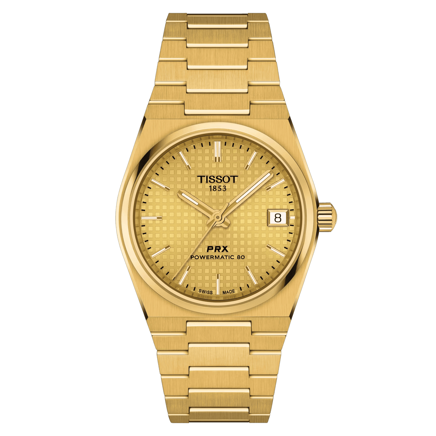 Tissot PRX 35mm Powermatic 80, a harmonious blend of nostalgic glamour and contemporary ingenuity. This 35mm watch features a high-quality gold-PVD case and a striking gold coloured dial. The gold variant, bold and purposeful, brings an undeniable dash of audacity to this automatic model. The waffle dial pattern lends further distinction to this timepiece. With water resistance up to 100 meters and a Nivachron™ balance hairspring, the PRX is an exquisite piece for those who appreciate the art of watchmaking. The satin-finish steel bracelet with a triple-blade folding steel clasp guarantees unyielding comfort. Be bold with the Tissot PRX 35mm Powermatic 80 in gold-PVD.