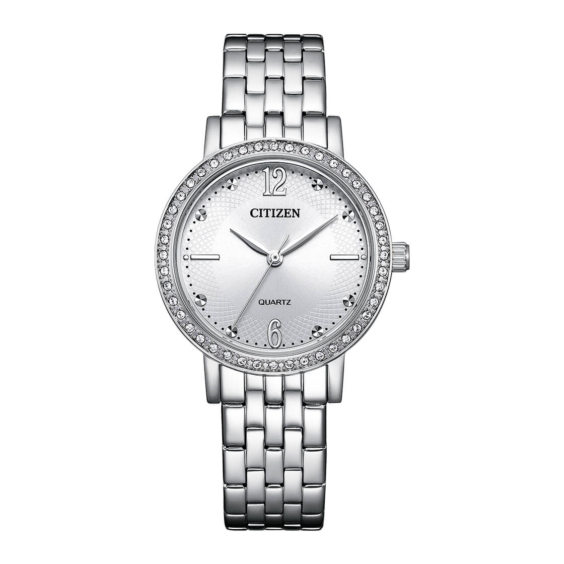 Discover elegance that shines with the CITIZEN Quartz Women’s Fashion Watch. This exquisitely designed timepiece features a 31mm stainless steel case paired with a matching stainless-steel bracelet, providing a seamless blend of durability and timeless style. The watch face is adorned with sparkling crystals, giving it a touch of glamour perfect for any occasion. The classic silver dial is complemented by simple yet elegant markers and hands, making for easy readability. This watch is not just about style; it’s crafted for everyday resilience with 5 bar water resistance and a hardy mineral glass protecting the dial. A fold-over clasp with push button ensures secure and comfortable wear throughout the day, while the reliable quartz movement keeps you punctually poised for all life’s moments. Embrace the perfect accessory for the modern woman, complete with a 1-year international warranty, ensuring your investment is protected. The CITIZEN EL3100-55A is a fashion statement that offers both function and flair. Elevate your wristwear collection with this stunning addition from CITIZEN’s Quartz Collection - where sophistication meets precision.