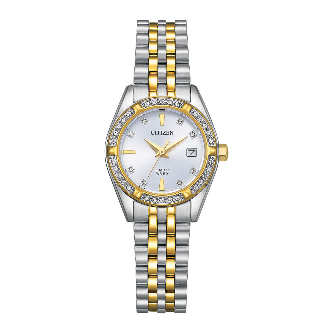 The new Citizen Quartz for women embodies classic elegance, designed with meticulous attention to detail. This timepiece features a Mother of Pearl dial set within a 26 mm stainless steel case, complemented by a two-tone bracelet. Crystal elements embellish the bezel, adding a touch of luxury. With 50 meters of water resistance and a reliable quartz movement, this watch is as functional as it is beautiful, making it an ideal choice for both everyday wear and special occasions