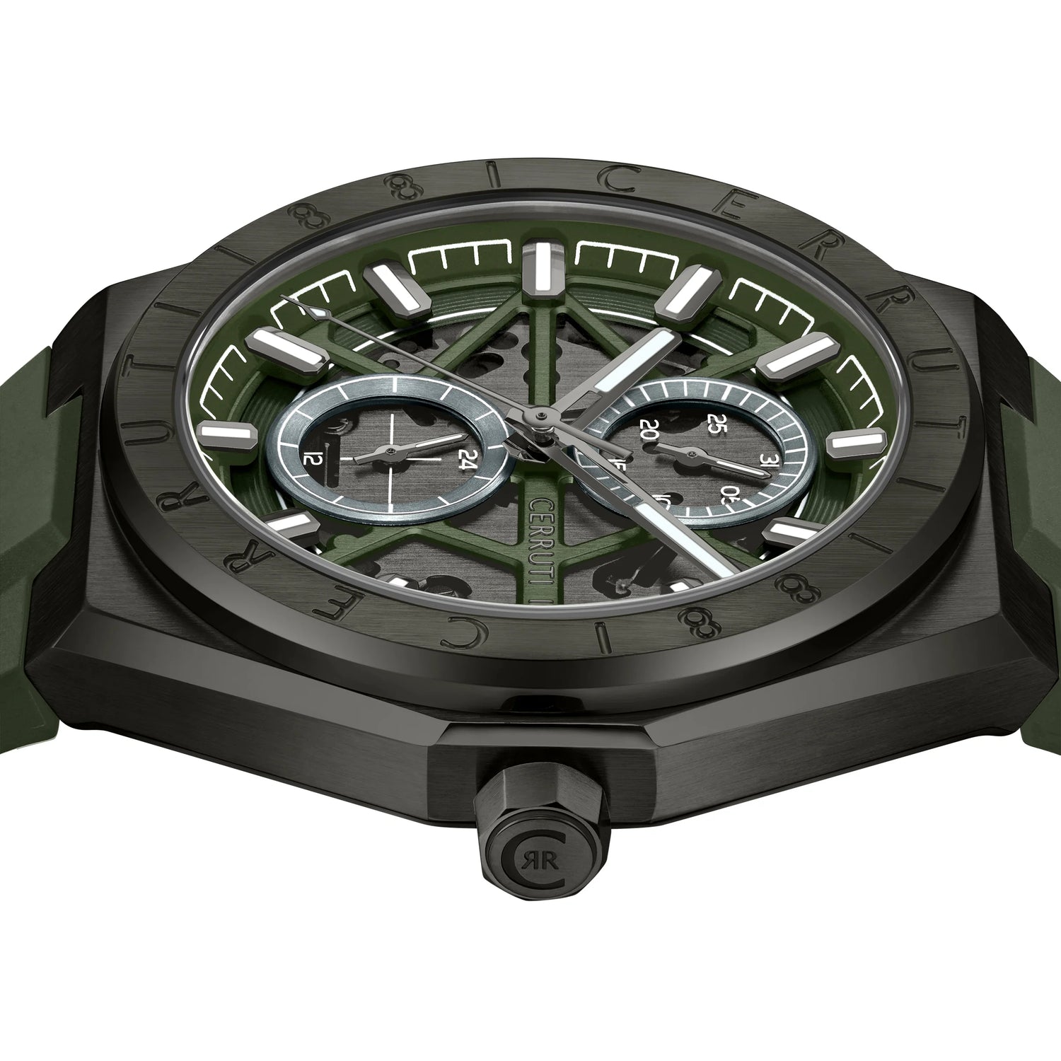 Ravello, a timepiece that seamlessly blends modern design with timeless functionality. The captivating black smoke dial offers a glimpse into the intricate mechanics at its core, while the multifunctionality ensures it's as practical as it is stylish. Capping it all off is the signature 'CERRUTI 1881' detailing on the topring, solidifying its place as a reliable companion. The integrated durable green silicone strap adds a touch of rugged sophistication, perfectly complementing the watch's luxurious appeal.