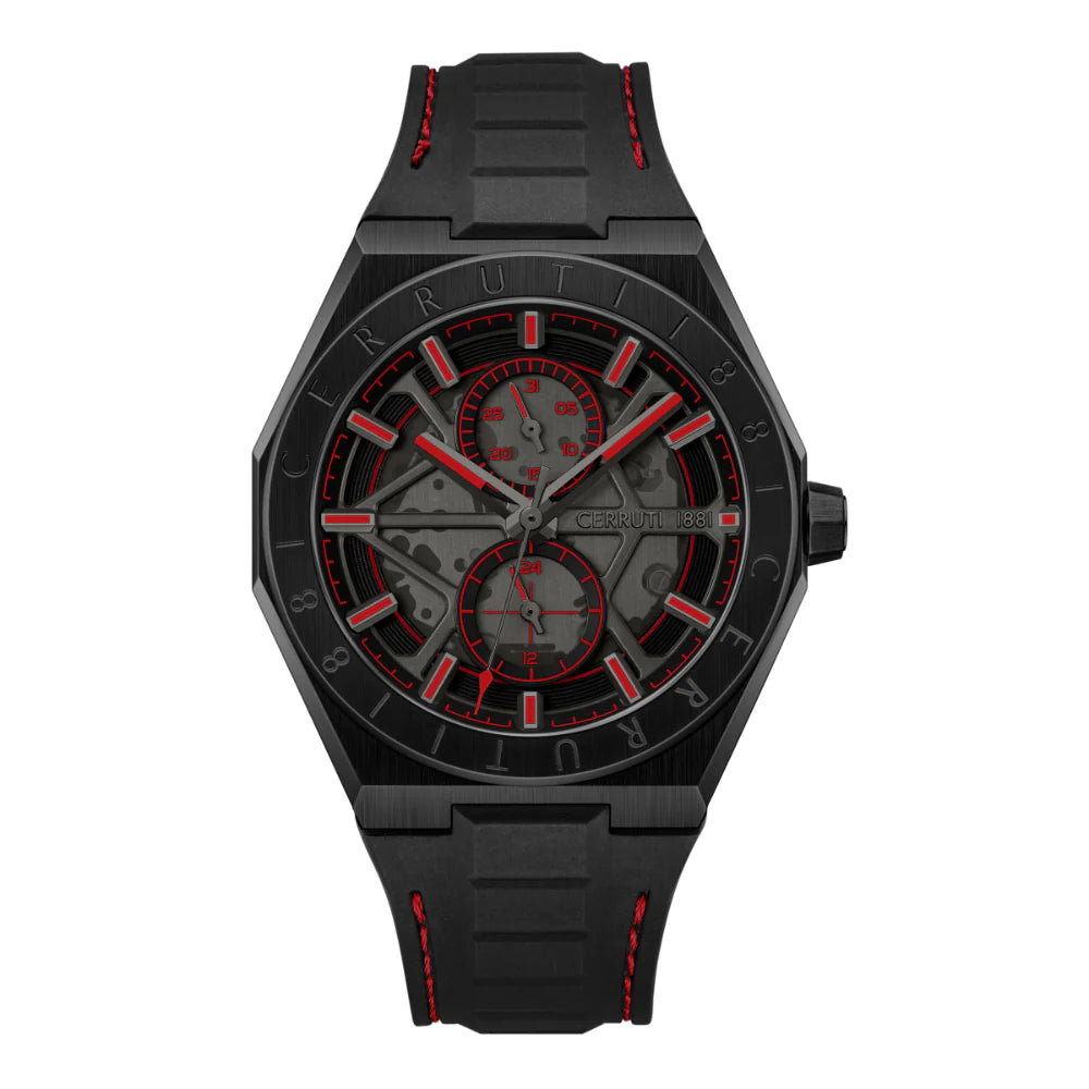 Ravello, a timepiece that seamlessly blends modern design with timeless functionality. The captivating black smoke dial offers a glimpse into the intricate mechanics at its core, while the multifunctionality ensures it's as practical as it is stylish. Capping it all off is the signature 'CERRUTI 1881' detailing on the topring, solidifying its place as a reliable companion. The integrated durable green silicone strap adds a touch of rugged sophistication, perfectly complementing the watch's luxurious appeal.
