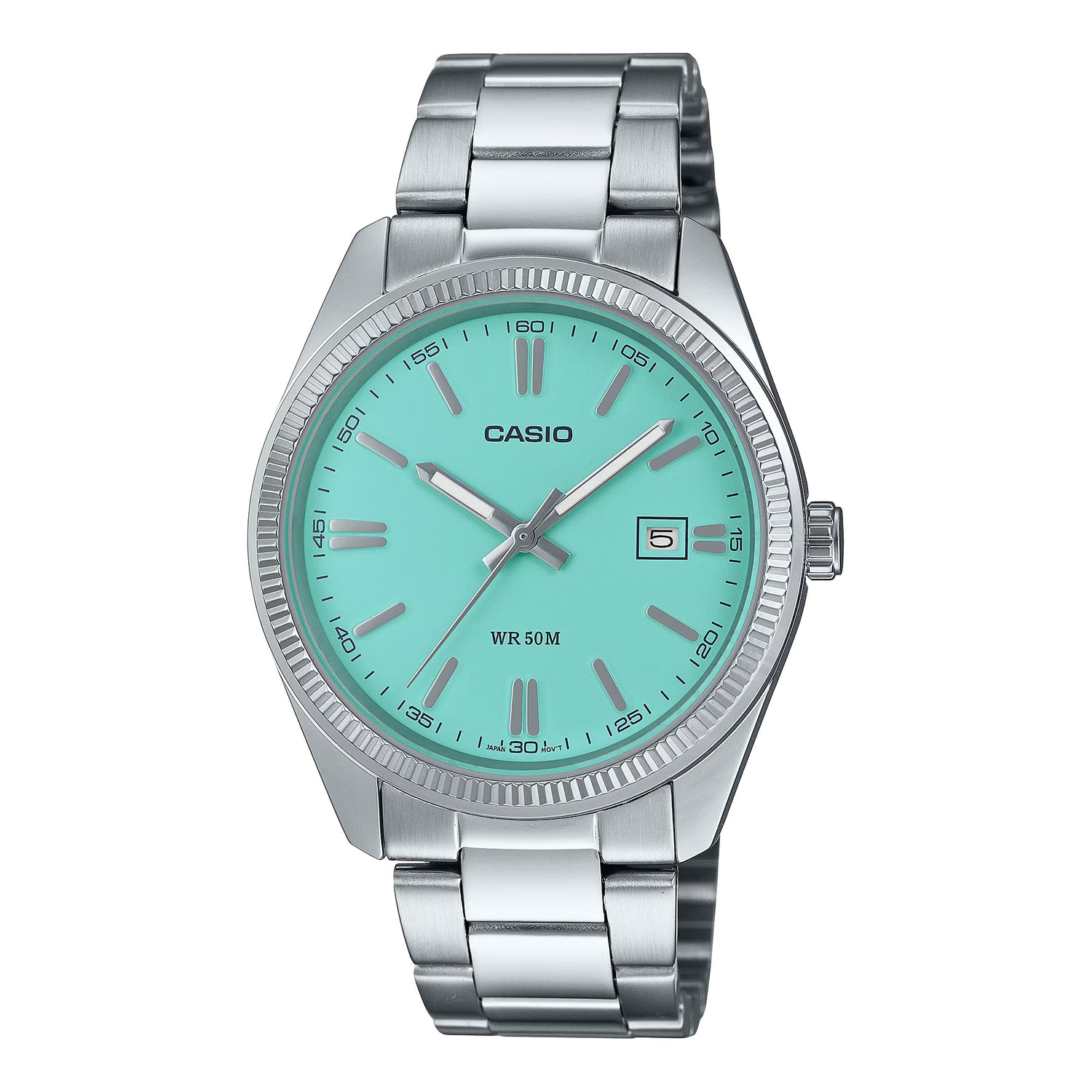 Elevate your style game with the MTP-1302D-2A2V. This timeless simple silver watch features a stunning turquoise blue dial that is complemented by luminous hands and markers, providing easy readability in low-light conditions. It is designed with a sleek stainless steel case and band, making it both sophisticated and durable.
